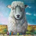 Ein kleiner Perspektivwechsel: ein großes Schaf steht vor einer Mauer, auf deren Krone eine Gruppe von kleinen Wanderern Platz genommen hat, und fragt sich, wer das wohl ist.
